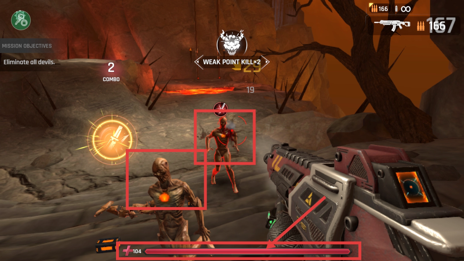 战斗时精准锁定恶魔的弱点发起攻击,成功达成【Weak-Point-Kill×2】的成就,同时将生命值维持在【104】,通过不断积累连击次数来提高战斗的效率。