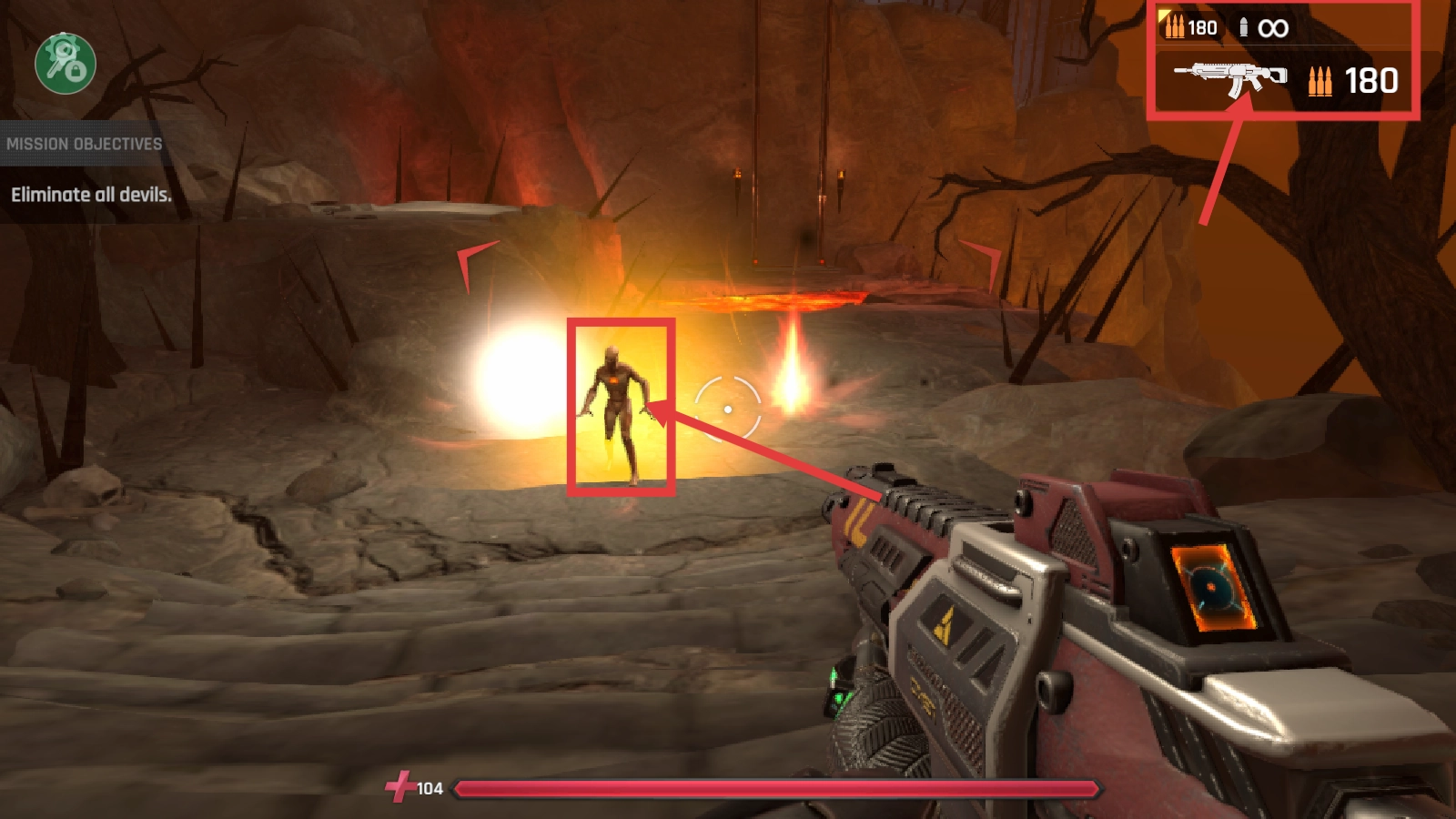 任务【清除所有恶魔】,使用右上角武器弹药【180】,对准恶魔精准开火,逐个消灭敌人。