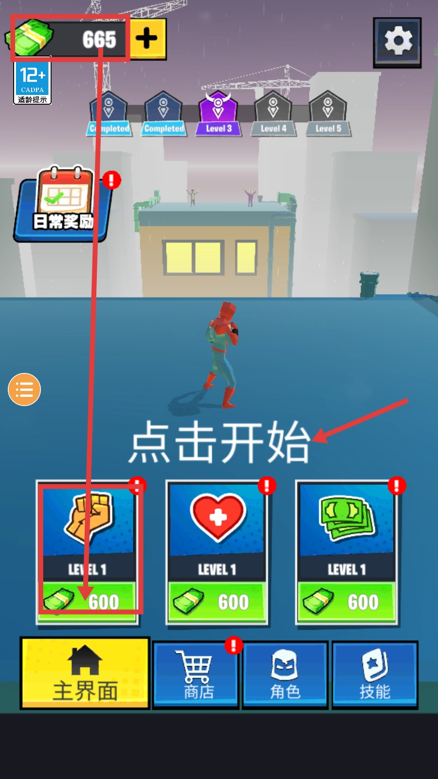 请注意12+-CADPA适龄提示,当拥有665钞票时点击【点击开始】,会消耗600钞票将【拳头-LEVEL1】升级,以此提升战力。