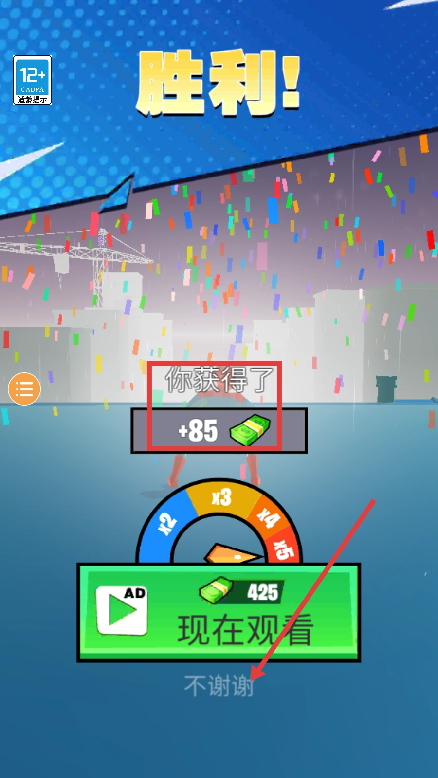 通关成功后将获得85张钞票,要是你不想看广告的话,点击【不谢谢】就能继续积累资源去挑战下一关啦。