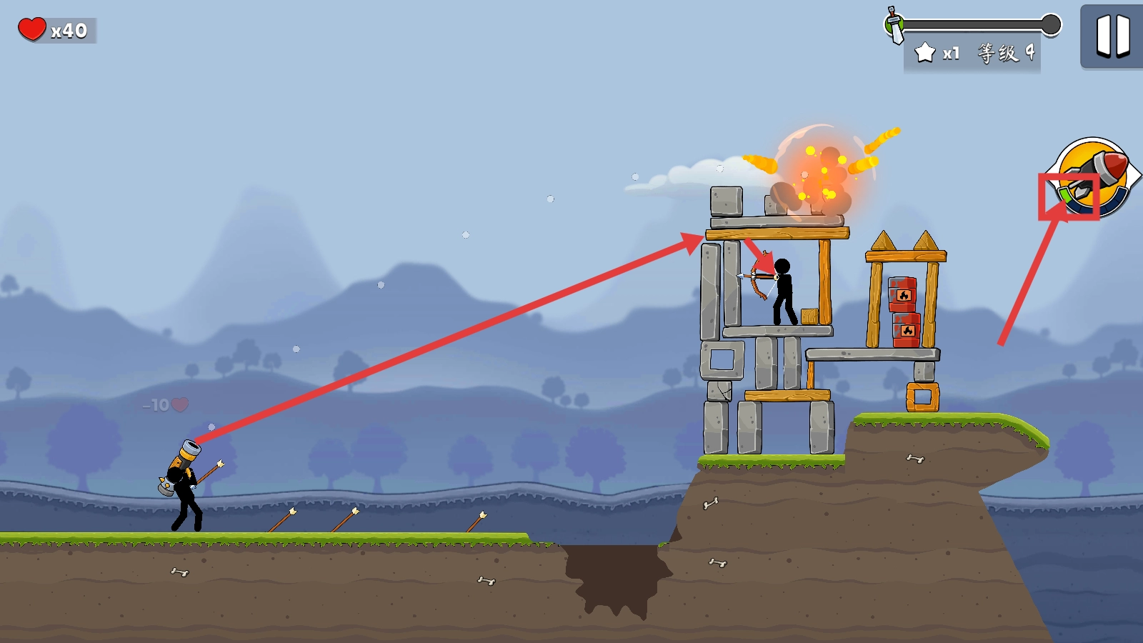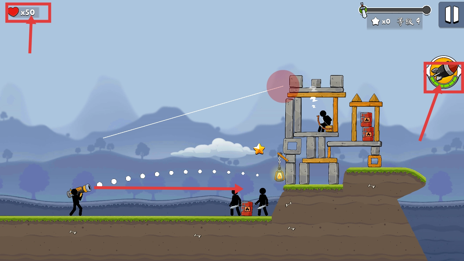在战斗时运用火箭武器去打击敌方的弓箭手,要留意生命值的变动情况,同时收集星星来提高关卡的评分。