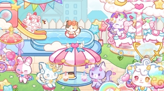 看,这就是游乐园!小猫们能在超漂亮的旋转木马上转圈圈,也能在泳池里开心地嬉戏,还能在小舞台上表演,活脱脱像个大明星呢!这儿还有一家商店,在里面你可以挑选超可爱的小玩偶,以及精致的配饰和好看的衣服!
