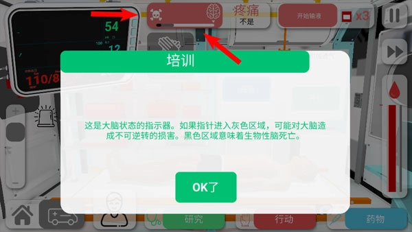 10、病人的血量情况:红色条代表循环血液,灰色条则是“血库”中的血液;这类血液储存在器官里,承担着应急储备的功能;当发生失血时,它会补充到血液循环中。