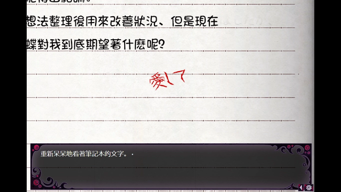 凤蝶开始亲手制作衣物来遮掩自己的非人特征,又戴上眼罩努力融入人类社会,还请求男主带她外出认识世界。在日常的相处互动里,两人的关系悄悄发生了变化,原本清晰的界限也慢慢变得模糊。最终,男主在一番自我挣扎后,选择勇敢面对这份不同寻常的情感,和凤蝶建立起了亲密的联结。可在这一切的背后,他才猛然发现,凤蝶其实一直都在默默地观察着他的每一个举动。游戏设置了两种结局:一种是彼此接纳、相伴度过余生的温暖结局;另一种则是因为恐惧选择逃离,反而被囚禁起来,被迫接受扭曲之爱的暗黑结局。