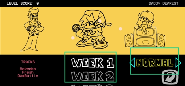 游戏分为多个Week(周),每个Week都会设置不同的对手角色和歌曲(一般是3首)。