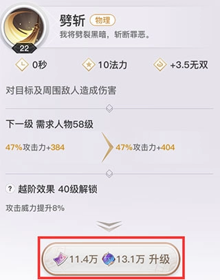 人物的战斗技能和无双技能每次升级都会提升战力,不同的技能等级带来的战力提升幅度也不一样。
