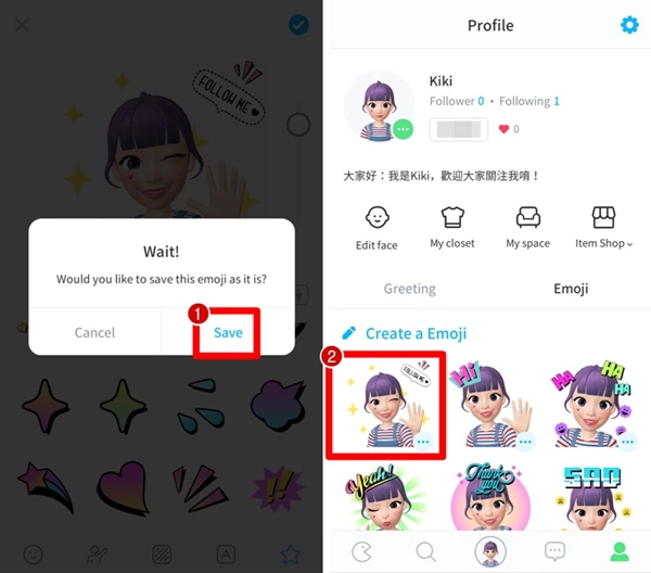 2、【Save储存】→【自己制作的表情贴就显示出来啦】;