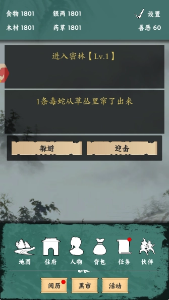 4、我们进入密林,毒蛇袭来,我们可以选择躲避或是迎击。