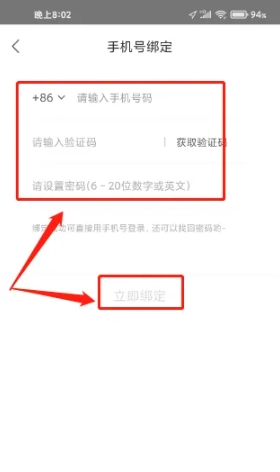 2、进入手机号绑定界面后,请按顺序输入您的手机号码,接着接收并填写短信验证码,再设置账户密码,最后点击“立即绑定”按钮,即可完成绑定操作。