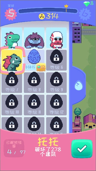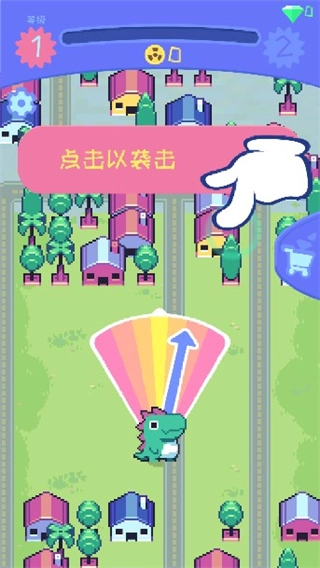 怪兽冲刺中文版(Kaiju Rush)是一款主打轻松解压的休闲游戏,整体采用复古像素风格设计,角色造型Q萌可爱,洋溢着满满的童趣。玩家将化身为一只活力十足的小怪兽,在城市里自由奔跑、跳跃,尽情地摧毁高楼大厦。游戏的操作方式非常简单,只需用单指点击就能控制发射角度,并且要在落地时抓住最佳时机——当破坏范围的提示圈达到最大时点击,就能触发爆炸性的破坏效果。此外,通过积累金币,还可以不断强化小怪兽的力量、速度、金币获取效率以及挂机收益。