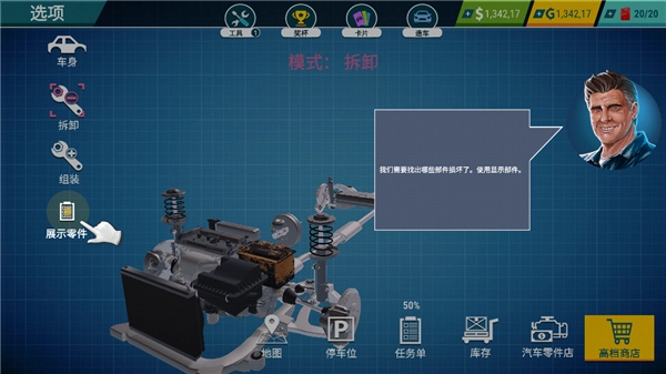 回到主菜单,进入汽车零件商店,依据故障提示筛选出与车型匹配的新零件。