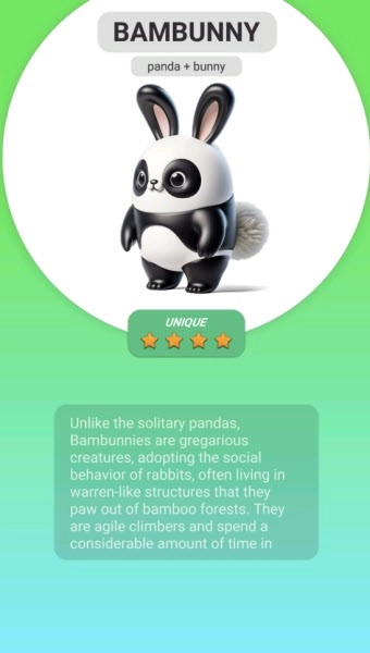 在游戏里创造各式各样的动物,玩法十分简单,只需挑选两种动物进行融合就行。玩家能按照自己的心意自由搭配、随意选择,瞧瞧能生成怎样的动物。每一种融合出的动物都有着独一无二的外观和属性,因为AI的存在,每次融合都会产生不同的结果,有着无限的可能性。
