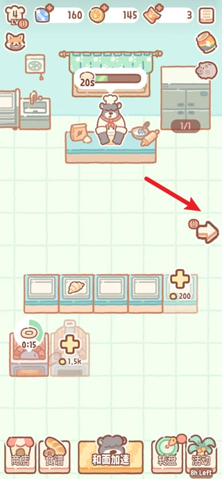 1、进入面包店后,能看到前厅与后厨两个区域,通过箭头可切换不同区域;挑选对应的食材就能制作面包,点击下方的“和面加速”按钮可提升制作效率。