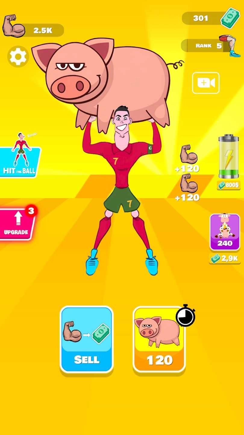 2、用手指快速点击屏幕,提升C罗的力量值,你能通过锻炼获取金币,用金币购置各类健身装备,升级强化各项物品,最终成为顶尖的举重王者。