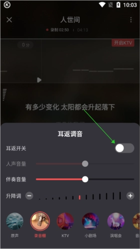 2、在弹出的新页面里,点击底部工具栏上的【耳返调音】(即下图绿色箭头指向的选项)