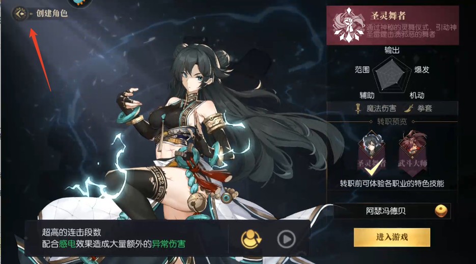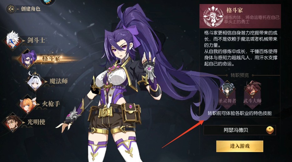 3、以格斗家为例,其能够转职为圣灵舞者或者武斗大师,这两个转职方向各有差异。像圣灵舞者具备良好的辅助能力,武斗大师在爆发能力上则更为显著。若要退出预览,点击左上角箭头即可。
