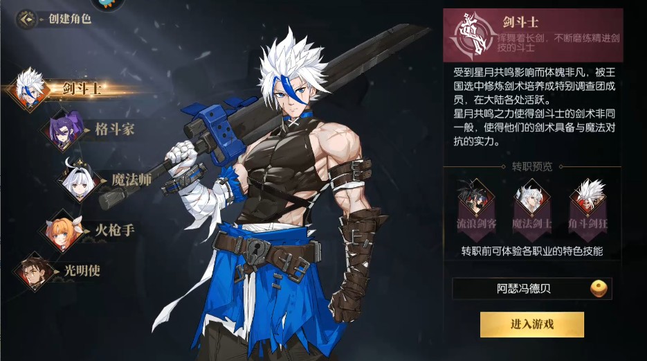 6、以剑斗士为例,其拥有流浪剑客、魔法剑士、角斗剑狂这三个转职方向。