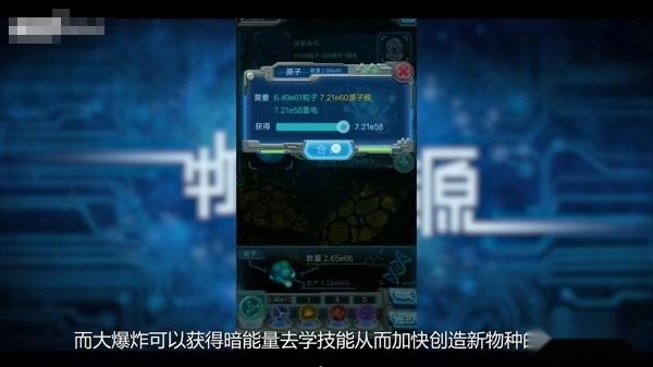 这里再简要梳理一下粒子、尘埃、雷电、智慧、暗物质这几个概念的关联。游戏里要持续创造和积累新物种,就得不断收集暗物质,而暗物质只能通过升级物质与混沌来获取。因此,为了升级物质和混沌,就需要持续积累粒子和尘埃。而制约粒子与尘埃产量的主要因素又是雷电。当粒子和尘埃的总量达到要求后,升级物质和混沌不仅能提升雷电的产量,还会有一定概率得到暗物质。智慧是游戏里相当珍贵的资源,它的产量很低,而且只能依靠时间来累积。它的作用一是作为触发大爆炸的唯一条件,二是可以直接当作货币来购买粒子、尘埃和雷电。所以粒子、尘埃和雷电三者之间是相互促进、互为补充的关系。粒子和尘埃能够提升雷电的产量,而雷电又反过来可以增加粒子和尘埃的产量,同时雷电的产量还限制了粒子和尘埃产量提升的速率。提升粒子产量只需要雷电,而提升尘埃产量则需要粒子和雷电。所以这样解释之后你会发现,在游戏中合成粒子和尘埃时,只有将雷电作为唯一的限制条件,才有可能获得最高的收益。