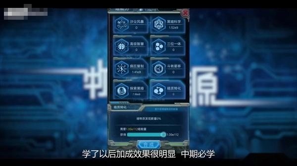 游戏里总共就10个技能,到后期都是要学的。差异主要在于第一次爆炸时和中期阶段选择学哪几个,不同的加点方式会让发展速度存在一定差别。其中高级智慧和暗质转化属于必须学的技能,中期通常有两个发展方向:一个是基础路线,着重提升粒子、尘埃、雷电的基础产量;另一个是科技路线,专注学习科技类技能,依靠智慧来购买大量资源。