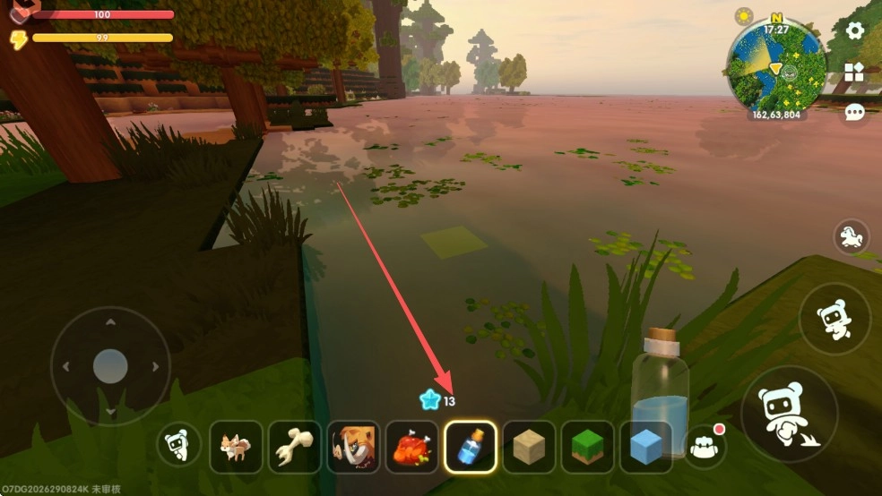 制作完小玻璃瓶后,先点击该物品,接着走到水域旁,再点击水域完成使用操作。