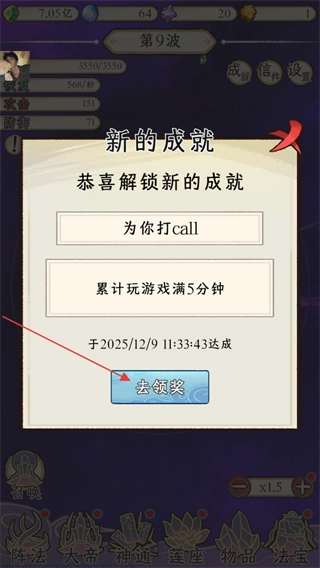 游戏界面会弹出新的成就提示,此次解锁的成就是“为你打call”,达成该成就的条件是累计游戏时长满5分钟,点击弹窗里的“去领奖”按钮就能领取相应奖励。