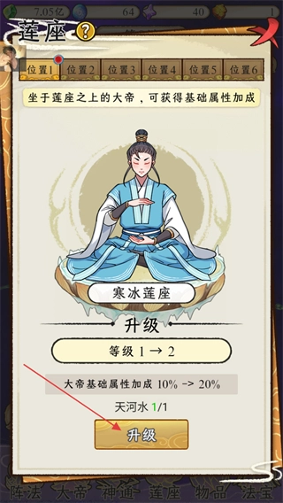 进入莲座界面后,寒冰莲座可对坐于其上的大帝进行基础属性加成,目前等级可从1级提升至2级,升级需消耗天河水1份(当前已满足1/1的消耗条件),点击升级按钮即可提高属性加成的比例。