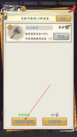 在法宝界面里,目前正在使用的法宝为开天神斧,若要炼制新法宝,可点击免费炼制对应的“炼制法宝1/9”按钮来进行操作。
