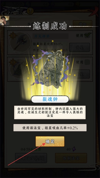 炼制法宝成功后会弹出提示,此次获得的法宝是裂魂钟,它能带来祖星吸血几率增加0.2%的效果,点击确定按钮即可关闭这个提示弹窗。