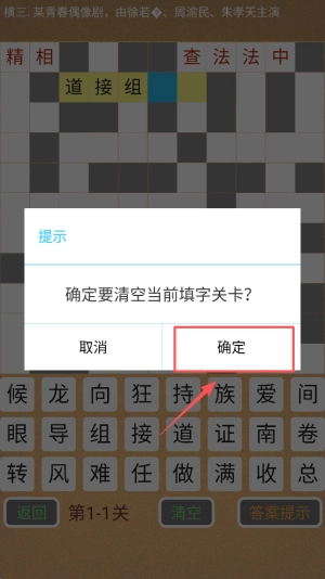 清空重填:当弹出“确定要清空当前填字关卡?”的提示界面时,点击“确定”即可重新填写。