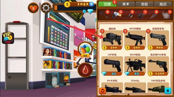 从图钉、黑板擦、铅笔、贴纸、美工刀这类小物件,到钉枪、针筒,甚至还有汽车、病毒马桶搋子,以及黄脸婆!(哈哈,看来老板果然怕老婆!)不过每种用具都得用金币购买,有些甚至需要充值才能买到呢!