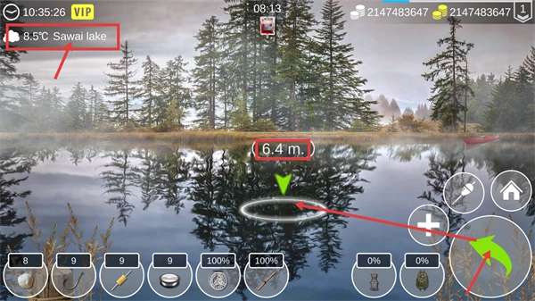 在Sawailake(当前环境温度8.5℃)的垂钓界面,选定【6.4m】区域完成下钩操作,准备开启本轮垂钓流程。