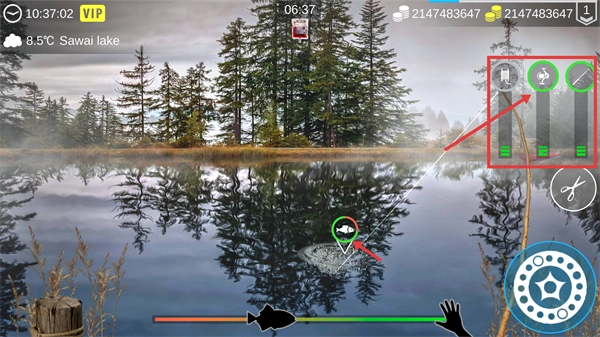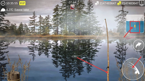 当浮漂出现异常动静时,借助界面右侧的鱼竿操作按钮完成咬钩阶段的互动,以此触发鱼的咬钩状态。
