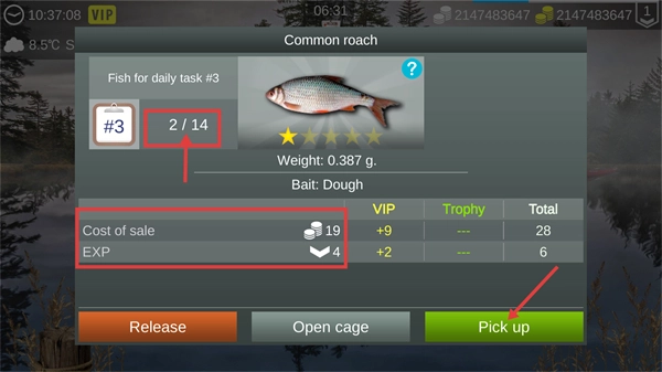 成功钓获【Commonroach】:此次渔获匹配日常任务#3,所用饵料是Dough,能得到19货币和4经验,点击【Pickup】领取这次的收获。