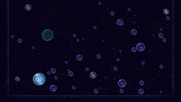 唯一的变量是玩家操控星球所喷出的气泡,气泡的作用有两个:一是为星球提供移动动力,二是能够推开周边的其他星球。借助气泡的这些功能,当玩家操控的星球靠近其他星球时,就可以利用惯性以及气泡产生的推力,将逼近自己的红色星球推开。