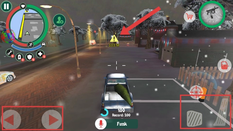 驾驶车辆时,通过左侧的方向按钮操控行驶方向,右侧的踏板按钮调节车速,前往带有距离标识的任务目标位置(例如103米处)。
