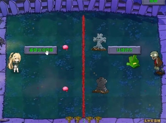 当玉米投手投完所有子弹后便会开启下一轮,若承受这次投掷则是给自己,若让给对方则是给僵尸,当取得两次胜利即可通关。