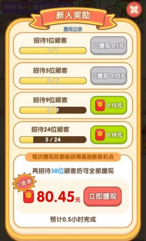 这游戏确实能赚钱。每招待一位游戏内的顾客,就能拿到0.1元红包,还能触发膨胀奖励的机会,最高能涨到5元——我上次就直接翻倍到了4.7元呢!而且招待的顾客越多,赚的红包也会跟着变多,第二次兑换红包的时候,系统提示还得再招待4位顾客才行。