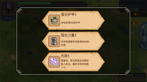 角色会自动发起攻击,击败敌人后会掉落经验值,当收集到足够的经验值时就能升级,玩家可从三种能力里挑选一种。