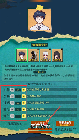 2、选定【平平无奇】这一身份后,会被分配【可用点数-5】;建议优先将点数加在【技巧】上,以此提升基础钓鱼成功率;同时记得激活【八面玲珑】天赋,获取额外收益。