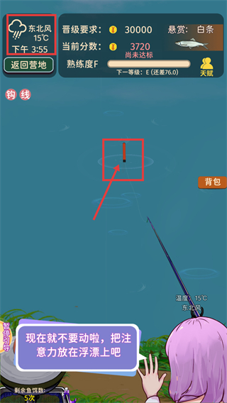 3、进入钓鱼界面后,按照提示关注【浮漂】,保持稳定操作,留意【当前分数-3720】和【晋级要求-30000】,逐步积累熟练度。