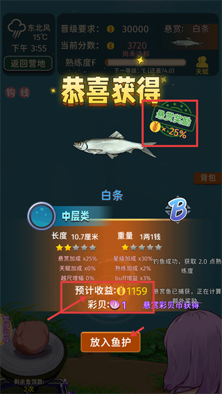 4、钓到【白条】后,点击【放入鱼护】可获得【预计收益-¥1159】和【彩贝-1】,利用【悬赏奖励-+25%】能提高收益效率。