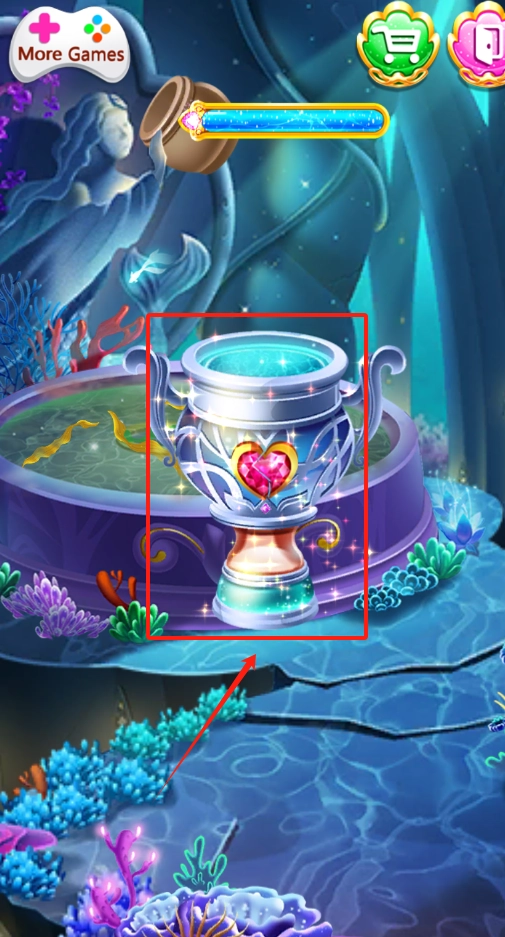 1、找到红框里的粉色播放按钮,点击它就能进入Mermaid Secrets 35 Ocean War游戏了。