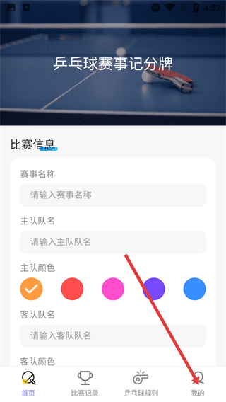 进入乒乓球赛事记分牌页面后,可在【比赛信息】栏填写【赛事名称】-【主队队名】等信息,之后点击底部的【我的】选项,即可进入个人相关页面。