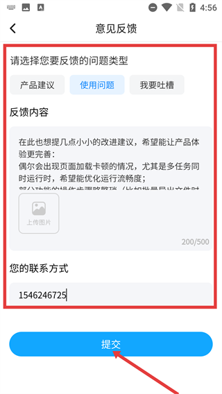 4、进入【意见反馈】页面后,先选择对应的【问题类型】,接着填写【反馈内容】与【联系方式】,最后点击【提交】按钮,即可完成反馈流程。