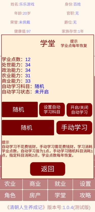 《清朝人生养成记》是一款模拟经营养成游戏,这里有丰富多样的模拟玩法与养成内容等待你的探索。在游戏中,你可以持续完成各类任务,解锁更多经营玩法与简易模拟内容,尽情享受养成的乐趣。相信这款游戏能让你满意,喜爱经营类游戏的朋友千万别错过!别再犹豫了,快来本站体验吧!