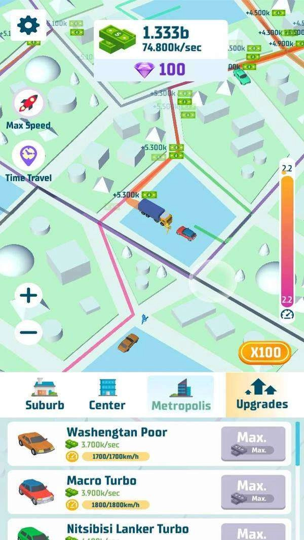 2、购置新车为人们提供了更丰富的选择。你还能点击升级按钮,把各项属性都提升至最高级别,如此一来也能赚取更多收益。