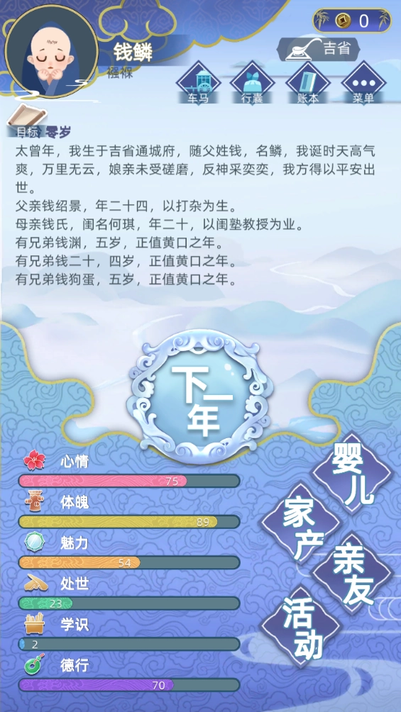 【3岁阶段】解锁向父母要钱的功能,这是重要的启动资金来源!记得“请安”,隔年请安会增加德行值;同时解锁寺庙场景,参拜文殊菩萨可提升学识,前期建议优先积累学识——若参拜选项中没有文殊菩萨,先点“我就看看”退出,再重新点击参拜,直到刷出文殊菩萨选项再进行参拜。