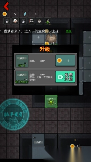6.中期阶段可以通过观看视频来升级门,接着升级床,搭建游戏机能够获取体力,这样更便于建造高级武器。