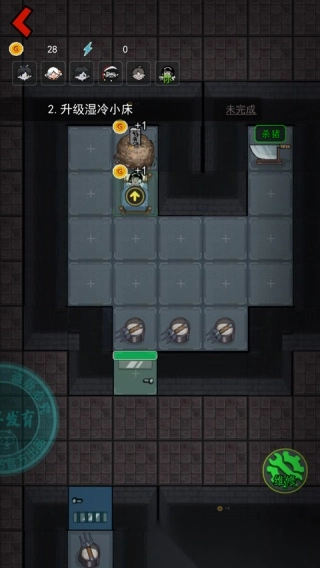 5.倒计时剩余5秒时升级床铺,接着将大门升至2级;若幽灵率先发起攻击,就搭建武器,之后再升级大门;当大门即将被攻破时,可点击修复按钮。
