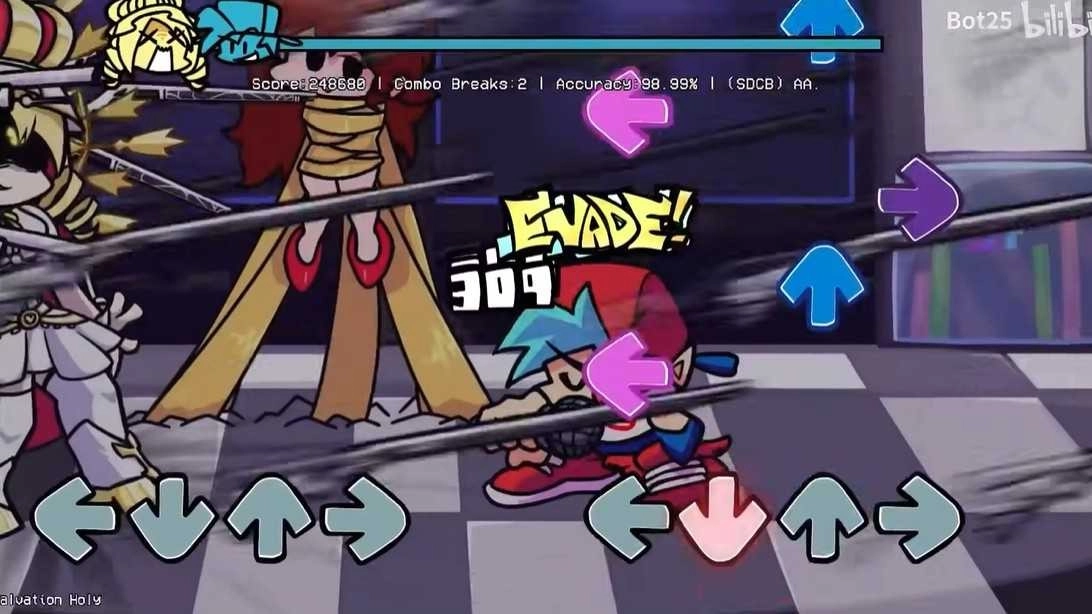 2、随着背景音乐节拍的变化,在屏幕上精准按下上下左右方向键,以此触发连击效果,进而压制对手的气势条。